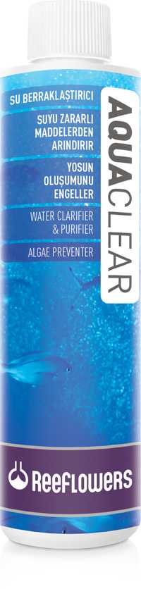 Suda serbest olarak yüzen küçük parçacıklar suyun bulanık görünmesine sebep olur. ReeFlowers AquaClear, suda bulanıklığa sebep olan bu küçük parçacıkları bağlayarak topaklanmalarını ve filtre ekipmanları tarafından kolayca tutulmalarını sağlayarak suyu berraklaştırır ve temizlenmesini sağlar. Suyu zararlı etkenlerden arındırır. Yosun oluşumunu engeller.
