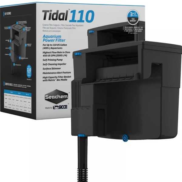 Seachem Tidal 110 Askı Filtre, 500 litreye kadar olan tatlı su ve deniz akvaryumları için tasarlanmış, yüksek performanslı ve çok yönlü bir akvaryum askı filtresidir.