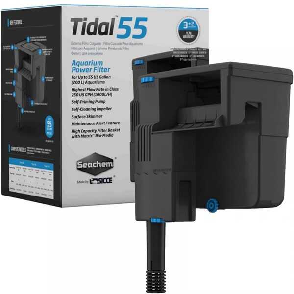 Seachem Tidal 55 Askı Filtre, 250 litreye kadar olan tatlı su ve deniz akvaryumları için tasarlanmış, yüksek performanslı ve çok yönlü bir akvaryum askı filtresidir.