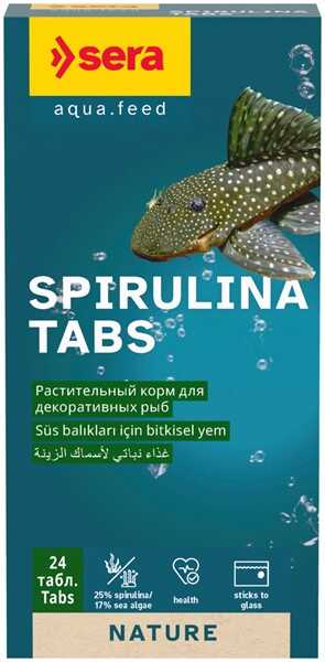 Sera Spirulina Tabletler canlı doğuran dişli sazangiller, Doğu Afrika çiklitleri ve diğer alg yiyenler için ideal yemdir. Ancitrus gibi vakum ağızlı kedi balıkları da ayrıca bu yemi sever. %25 Spirulina sayesinde tabletler yüksek bir miktarda renk verici karotinoidlerin yanı sıra oldukça kolay sindirilebilen proteinleri de içerir. Tablet akvaryum camına bastırılarak ön panelden rahatlıkla kontrollü ve yönlenririlebilen besleme sağlar.